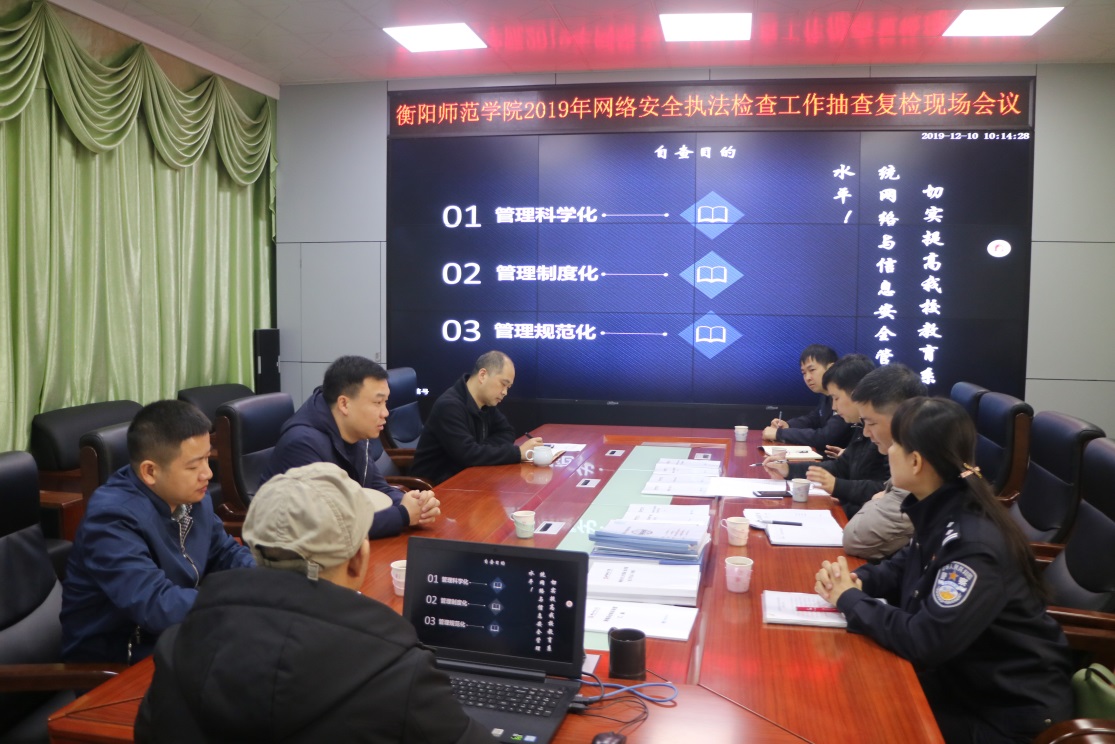 12月10日上午,衡阳市公安局网技支队队长王鑫一行5人来到学校,通过听取汇报、实地检查等方式对我校开展2019年网络安全执法检查工作抽查复检。